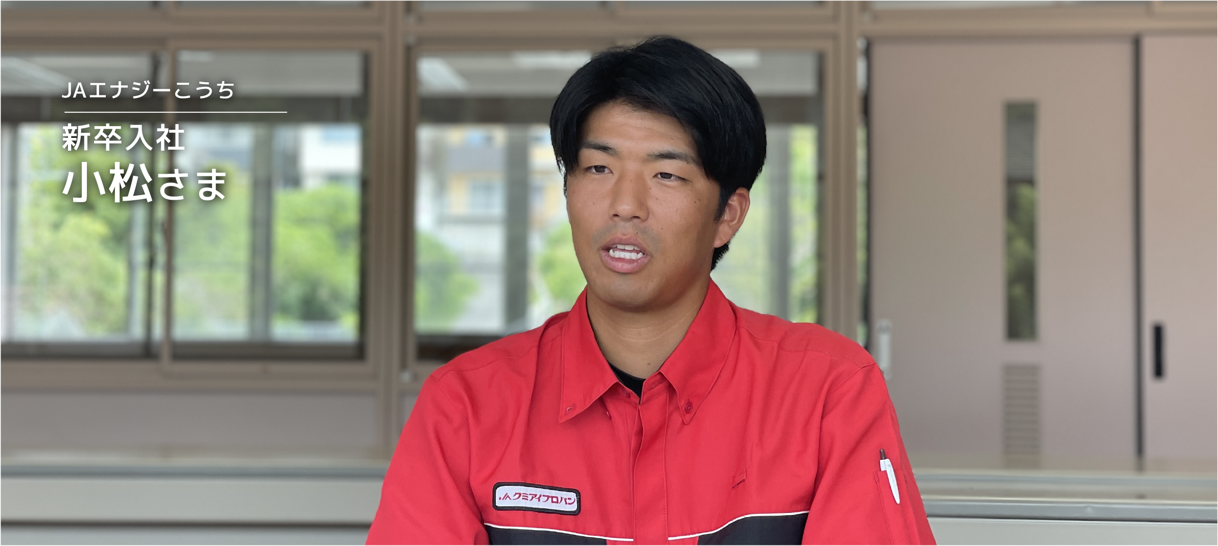 小松さまは、JAエナジーこうちでガスボンベの配送を担当しています。就職のきっかけは、オンライン合同就職説明会でJAエナジーこうちを知り、地元に近いことから入社を決意しました。